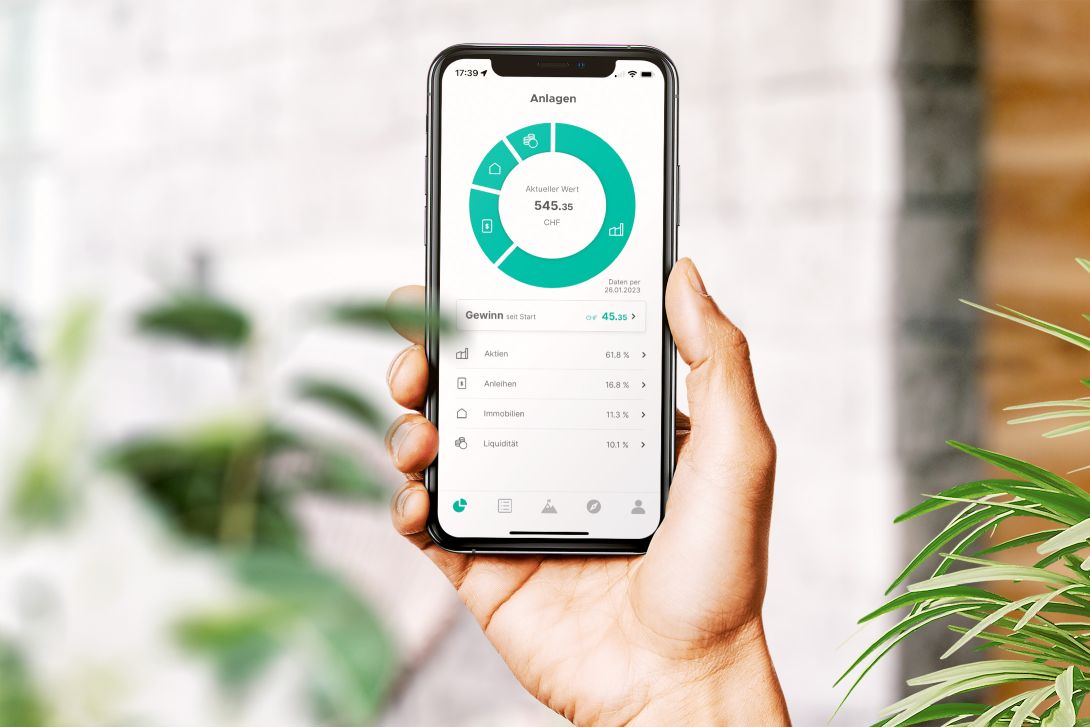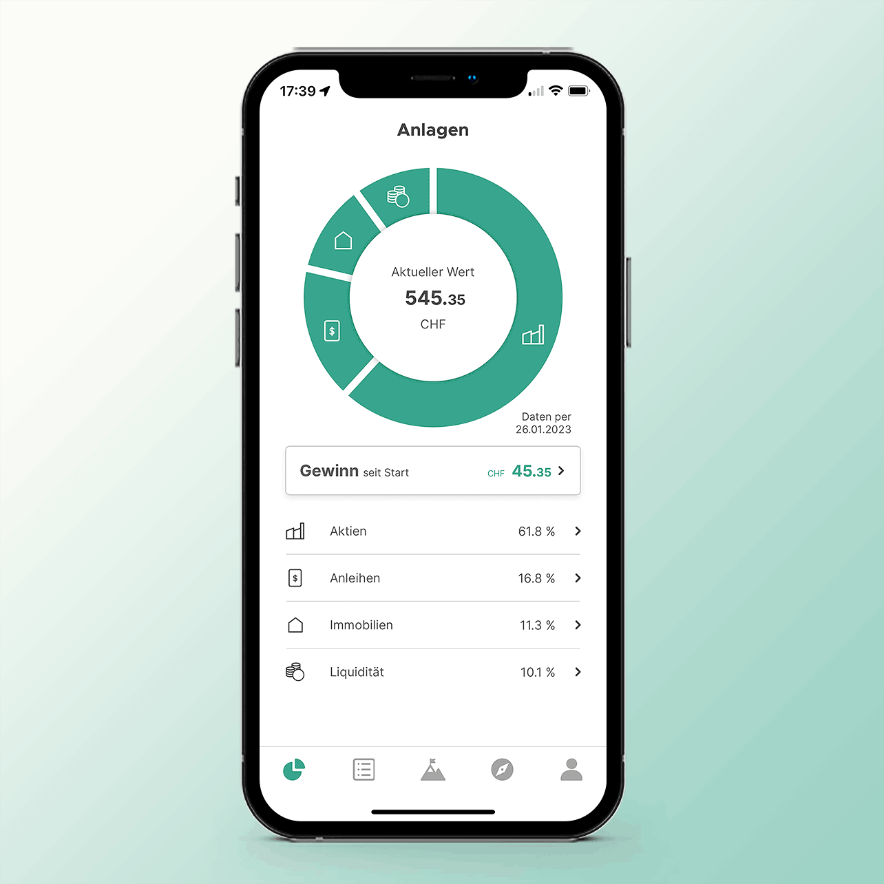 Auf dem Hauptscreen der App ist der aktuelle Portfolio-Wert sofort sichtbar und ebenso wird die Performance klar und deutlich ausgewiesen. Im kreisförmigen Diagramm ist auch die Aufteilung nach Asset-Klassen (Aktien, Anleihen, Immobilien und Liquidität) visuell sichtbar und in der Liste unterhalb ist deren Gewichtung auch in Zahlen ablesbar.