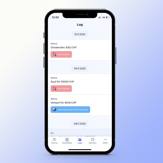 Der Log ist eine schlanke Timeline aller Bewegungen im Portfolio. Hier sind Einzahlungen, Käufe und Verkäufe von ETF-Anteilen, Gebührenzahlungen und Dividendenausschüttungen aufgelistet.