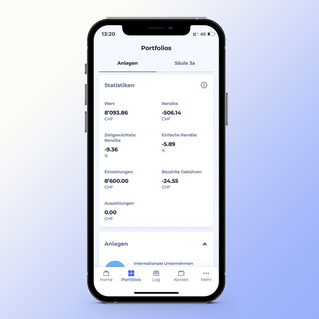 Unter Home findet man die Konto-Übersicht: Wie viel man einbezahlt hat, die Entwicklung und der aktuelle Wert des Portfolios. Alles gleich klein, buchhalterisch, nüchtern. Nicht mal ob das Portfolio im Plus oder Minus ist, wird farbig vermerkt. Der Link zur aktuellen Entwicklung des Portfolios ist kaum sichtbar ausgezeichnet. Zur Steigerung des Customer-Lifetime-Value wird man dafür umso prominenter darauf hingewiesen, ein Säule 3a Konto zu eröffnen.